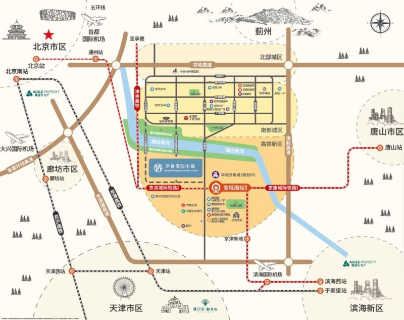 隨著高鐵新城建設進程的提速,未來城市南移將帶動人口的大流動。雅居樂·津僑國際小鎮(zhèn)作為高鐵新城的時代封面,是推動寶坻高鐵經(jīng)濟發(fā)展的“排頭兵”,更是打造展現(xiàn)寶坻城市形象的新窗口,發(fā)展重點;大量資源、配套、政策向此傾斜。本次首開產(chǎn)品更是地塊內(nèi)距離高鐵站最近的產(chǎn)品,舉步即達,未來京唐、京濱、津承三條城際線路交匯于此,寶坻將成為天津、北京、唐山三城經(jīng)濟區(qū)交匯中心點。不久的將來,從此至北京通州僅需18分鐘,半小時內(nèi)抵達天津市區(qū)、唐山、濱海新區(qū)。寶坻的跨越發(fā)展,觸手可及,居于此的生活,即可享受京津冀城市圈生活的繁華與便利。