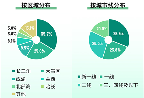 截至2020年12月31日,集團(tuán)在管項(xiàng)目達(dá)到2877個(gè),覆蓋全國31個(gè)省、直轄市和自治區(qū),163座城市。在管面積的35.7%位于長三角城市群,25.0%位于粵港澳大灣區(qū),9.5%位于成渝城市群,8.1%位于蘭西城市群,3.6%位于北部灣城市群,3.0%位于哈長城市群,其余分布于中國其他區(qū)域。按城市線分布,新一線29.9%,一線23.8%,二線26.3%,三四線及以下20%。