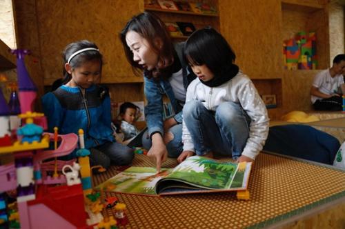 志愿者與學(xué)生在童趣園里共讀繪本